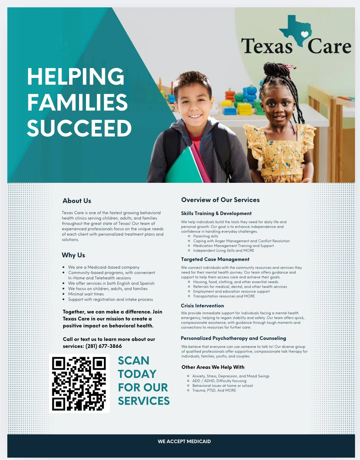 The Village Life Center is a bilingual, full-service mental health agency offering outpatient and community-based services to children, adolescents, and adults across Texas. Their programs support individuals, parents, caregivers, foster families, school staff, healthcare providers, and members of the judicial system. Services are available to youth under 18 and adults 18 and older, with a commitment to inclusivity regardless of race, gender, religion, ethnicity, sexual orientation, location, or income. The Village Life Center accepts all Texas Medicaid plans and provides compassionate, accessible care to all eligible clients.